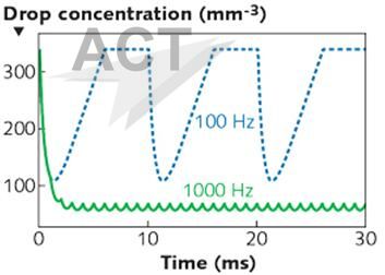 雖然重復(fù)頻率為100Hz光束中的脈沖,可以在一定程度上從光束路徑中清除液滴,但是脈沖之間的時(shí)間足夠長(zhǎng),使得光束中的液滴在脈沖之間得以補(bǔ)充(見(jiàn)圖1)。但是重復(fù)頻率為1000Hz的光束將產(chǎn)生一種穩(wěn)定狀態(tài),這使得液滴在脈沖之間沒(méi)有時(shí)間重新進(jìn)入光束路徑。