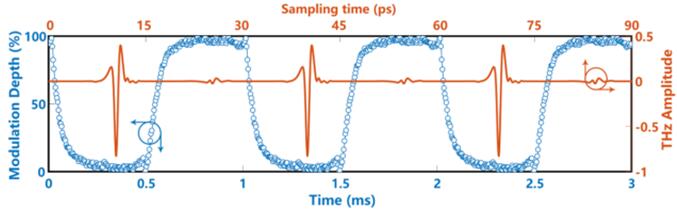 對(duì)1kHz方波電信號(hào)調(diào)制太赫茲時(shí)域波形(紅色)和調(diào)制深度響應(yīng)(藍(lán)色) 對(duì)速度的要求 調(diào)制的上升時(shí)間約為1ms,因此很容易實(shí)現(xiàn)1kHz的調(diào)制頻率。不過(guò),如果可以犧牲調(diào)制深度,也可以達(dá)到高達(dá)10kHz的頻率。雖然其他固態(tài)太赫茲調(diào)制器工作在大約2.4MHz的較高頻率段,也可以進(jìn)一些小調(diào)整提高該器件的調(diào)制頻率。目前受限于金接觸層之間的電阻和電容,通過(guò)將尺寸減小到1mm左右,并用石墨烯代替TiOx,調(diào)制速度與其他器件相當(dāng)。 香港中文大學(xué)材料科技研究中心主任許建斌解釋說(shuō),“這個(gè)裝置的另一個(gè)好處是可以被改造成現(xiàn)有的商用太赫茲光譜儀。”石墨烯控制的布魯斯特角太赫茲調(diào)制器將真正帶我們進(jìn)入太赫茲技術(shù)進(jìn)入現(xiàn)實(shí)應(yīng)用的未來(lái)。