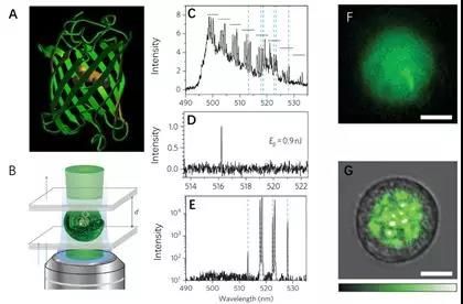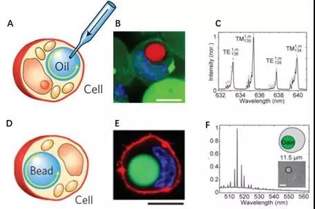 圖1.單細(xì)胞激光器 A 綠色熒光蛋白三維結(jié)構(gòu) B 單細(xì)胞激光示意圖 C D E分別是低于閾值,閾值附近和高于閾值的出光模式 F G分別是低于閾值和高于閾值細(xì)胞內(nèi)出光的空間分布模式 將此細(xì)胞置于琺珀諧振腔中,腔鏡是由兩面布拉格反射鏡構(gòu)成,腔長(zhǎng)d在20微米左右,細(xì)胞直徑在15微米左右,如圖1B所示。泵浦光源為波長(zhǎng)465nm的光參量振蕩器,脈寬5ns,重頻10Hz。經(jīng)顯微物鏡對(duì)腔內(nèi)細(xì)胞進(jìn)行泵浦,并探測(cè)其輸出光譜,得到了在不同泵浦功率下單細(xì)胞的激光輸出,圖1C,D, E,經(jīng)實(shí)驗(yàn)測(cè)量泵浦閾值擬合結(jié)果在1nJ左右。泵浦能量低于閾值時(shí),只是自發(fā)輻射發(fā)光(C);在閾值附近時(shí),只有一個(gè)模式的震蕩輸出(D);隨著泵浦功率的增加,其他模式的激光也得到放大輸出(E)。在持續(xù)數(shù)分鐘的激光放射后,細(xì)胞仍能保持其生理活性。雖然這種激光很微弱,持續(xù)時(shí)間只有幾個(gè)納秒,但能被清晰地探測(cè)到。除了人源細(xì)胞出光外,他們還實(shí)現(xiàn)了表達(dá)綠色熒光蛋白的單個(gè)細(xì)菌的激光輸出。 自帶諧振腔的細(xì)胞激光器 第一個(gè)活細(xì)胞激光器的成功實(shí)現(xiàn)為生物材料激光器研究打開了一扇門。但是第一個(gè)活細(xì)胞激光器使用了外加的諧振腔。為了更易于將激光器植入活體內(nèi),2015年,哈佛大學(xué)的Yun博士又在自己的實(shí)驗(yàn)室嘗試了細(xì)胞內(nèi)載有諧振腔的激光器—即基于回音壁模式微腔的細(xì)胞內(nèi)激光器。 回音壁模式光學(xué)微腔是一種特殊的光學(xué)諧振腔,它突破了傳統(tǒng)的基于腔鏡光學(xué)諧振腔的限制,通過邊界連續(xù)的全反射,可以將光子長(zhǎng)時(shí)間地局域在微腔內(nèi)形成回音壁模式的介質(zhì)諧振腔。因其具有超高Q值、極小的模式體積、超高的能量密度和極窄的線寬等優(yōu)越特性,成為一類典型的新型光學(xué)器件;匾舯谀J轿⑶豢梢栽诃h(huán)形或者球形的一些材料表面實(shí)現(xiàn)光信號(hào)的傳輸,在無標(biāo)記傳感探測(cè)領(lǐng)域具有其他光腔不可比擬的優(yōu)勢(shì)。目前已報(bào)道的回音壁模式微腔材料有液滴、二氧化硅、半導(dǎo)體和聚合物等材質(zhì)。借助于微納加工制造技術(shù)、光纖拉錐等技術(shù),回音壁模式微腔得到了迅猛發(fā)展, Yun博士和他實(shí)驗(yàn)室的Matjaž Humar采用以下幾種不同方式的回音壁微腔模式實(shí)現(xiàn)了細(xì)胞內(nèi)激光輸出: (1)向細(xì)胞內(nèi)注入油滴,如圖2A所示,油滴是混合了尼羅紅染料的聚苯乙醚,其折射率為1.69,而油滴外細(xì)胞液折射率可近似為水的折射率1.33。根據(jù)折射率導(dǎo)光原理,油滴在細(xì)胞內(nèi)會(huì)形成一個(gè)由尼羅紅染料提供增益的微球腔。在波長(zhǎng)535nm、脈寬5ns、重頻10Hz泵浦光作用下,得到回音壁模式輸出光譜,如圖2C所示。在此基礎(chǔ)上,考慮到豬皮的脂肪細(xì)胞內(nèi)含有單一的形狀規(guī)則的球形脂滴,將含有尼羅紅的溶液注射到豬皮下脂肪組織中,細(xì)胞中的脂肪顆粒被尼羅紅染色。在37℃、用535nm激光泵浦豬皮組織,輸出信號(hào)經(jīng)芯徑200μm的多模光纖耦合至光譜探測(cè)器,得到了豬皮組織中脂肪細(xì)胞的輸出光譜。 (2)利用高折射率材料的回音壁微球腔。人體細(xì)胞具有內(nèi)吞功能,可以將細(xì)胞外的物質(zhì)通過內(nèi)吞作用攝取到細(xì)胞內(nèi)以維持正常的代謝活動(dòng)。用人體宮頸癌HeLa細(xì)胞通過細(xì)胞內(nèi)吞作用可以使直徑11.5μm的熒光摻雜的聚苯乙烯微球進(jìn)入細(xì)胞內(nèi)部形成回音壁微腔,圖2D,E。在泵浦激光輻照下,實(shí)現(xiàn)了細(xì)胞內(nèi)的激光輸出,圖2F。除了將增益介質(zhì)摻雜在回音壁微腔內(nèi)之外,也可以將沒有熒光摻雜的回音壁微球置于含有熒光染料的細(xì)胞質(zhì)中,或者在微球表面包覆一層熒光染料,這樣也能夠?qū)崿F(xiàn)基于回音壁模式微球腔的細(xì)胞內(nèi)激光輸出。