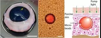 圖2 基于回音壁微球腔的細(xì)胞內(nèi)激光器 A 將油滴注入細(xì)胞內(nèi)示意圖 B含有油滴的細(xì)胞,紅色為尼羅紅染色的油滴,藍(lán)色為細(xì)胞核 C 基于油滴微腔的細(xì)胞內(nèi)激光輸出 D 細(xì)胞內(nèi)吞微球示意圖 E 內(nèi)吞聚苯乙烯微球的細(xì)胞,紅色為細(xì)胞膜,藍(lán)色為細(xì)胞核F 基于聚苯乙烯微球腔的細(xì)胞內(nèi)激光輸出。 植入組織中的激光器 在科幻電影中我們?cè)?jīng)看到過鐳射眼。細(xì)胞激光器具有極好的生物相容性,如果植入生物組織內(nèi)將不會(huì)引起機(jī)體的免疫反應(yīng),這為將激光器植入活體組織中提供了可能,活體組織發(fā)光將不再是夢(mèng)想。2017年,Matjaž Humar、Anja Dobravec等人報(bào)道了可植入牛眼角膜、血液和皮膚組織內(nèi)的微型激光器,如圖3所示。他們分別將直徑8μm的綠色熒光聚苯乙烯微球植入新鮮的牛眼角膜內(nèi)(n=1.37-1.38);直徑40μm摻雜尼羅紅染料的生物可降解PLA微球植入人血液內(nèi);以及直徑49.8μm的尼羅紅染料PLA微球植入豬皮組織內(nèi)。分別實(shí)現(xiàn)了眼角膜,血液和皮膚表面下200微米深處的激光發(fā)射。