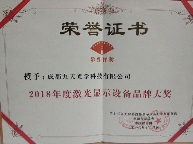 日前,由中國投影網(wǎng)、中國視聽網(wǎng)、數(shù)字標牌網(wǎng)、音響網(wǎng)等八大行業(yè)媒體聯(lián)合選出年度激光顯示設(shè)備大獎已經(jīng)新鮮出爐,在此次評比中,成都九天光學榮獲"2018年度激光顯示設(shè)備"獎。