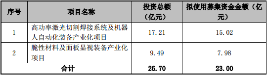 大族激光于2019年1月4日召開第六屆董事會第二十二次會議,審議通過《關(guān)于使用部分閑置募集資金暫時補(bǔ)充流動資金的議案》,同意公司在保證募集資金投資項目建設(shè)的資金需求、保證募集資金投資項目正常進(jìn)行的前提下,使用公開發(fā)行可轉(zhuǎn)換公司債券的閑置募集資金不超過10億元暫時補(bǔ)充流動資金,使用期限不超過董事會批準(zhǔn)之日起十二個月。 據(jù)稱,大族激光本次發(fā)行可轉(zhuǎn)換公司債券募集資金總額(含發(fā)行費(fèi)用)為23億元,募集資金已于2018年2月12日到位?鄢l(fā)行費(fèi)用后,這筆資金將投入高功率激光切割焊接系統(tǒng)及機(jī)器人自動化裝備產(chǎn)業(yè)化、脆性材料及面板顯視裝備產(chǎn)業(yè)化兩大項目,具體金額如下: