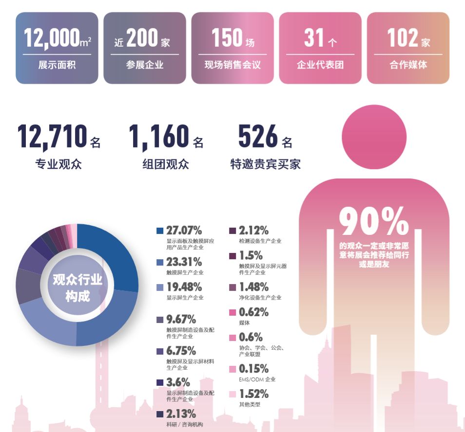 國際新型顯示技術(shù)展(以下簡稱為DISPLAY CHINA )、上海國際全觸與顯示展(以下簡稱為C-TOUCH & DISPLAY SHANGHAI)將于2019年6月26日-28日在上海新國際博覽中心盛大揭幕! 回首2018亮點頻頻 DISPLAY CHINA 2018盛況空前,展會面積達到12,000平方米,吸引了近200個業(yè)內(nèi)品牌集中亮相,三天參觀總?cè)藬?shù)累計達12,710人, 其中有超過31家業(yè)內(nèi)企業(yè)的1,160名專業(yè)觀眾組團參觀,到場特邀貴賓526人,現(xiàn)場實現(xiàn)近150場貿(mào)易配對和商務(wù)洽談。