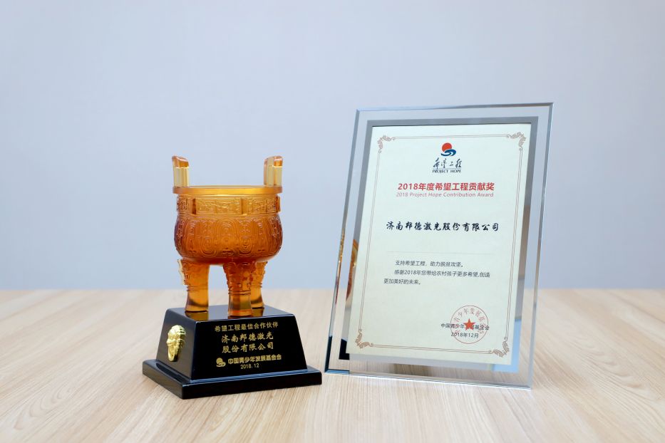 近日,邦德激光榮獲由中國青少年發(fā)展基金會頒發(fā)的2018年度“希望工程貢獻獎”,并被授予“希望工程最佳合作伙伴”稱號。