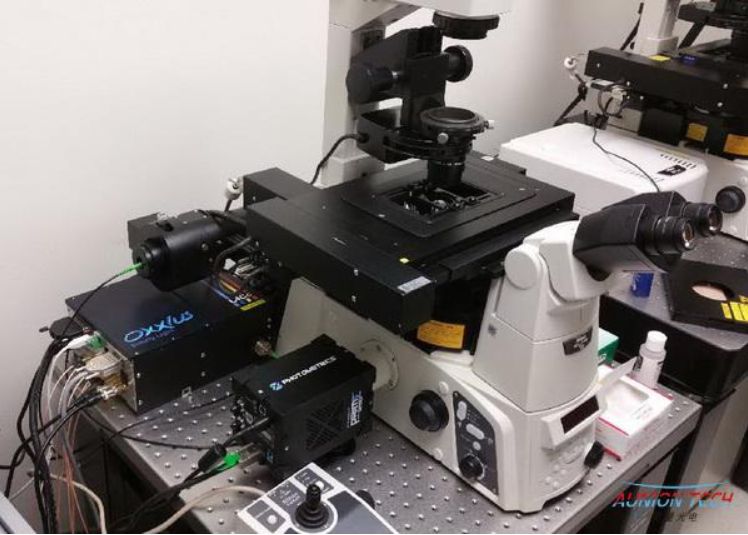 法國(guó)OXXIUS公司多波長(zhǎng)合束激光器 STORM和PALM超分辨顯微成像技術(shù) STORM技術(shù)中,使用Cy3和Cy5分子對(duì)作為熒光標(biāo)記實(shí)現(xiàn)超分辨成像,因?yàn)椴煌ㄩL(zhǎng)光可以控制Cy5在熒光激發(fā)態(tài)和暗態(tài)之間切換,例如紅色633nm激光可以激活Cy5發(fā)射熒光,同時(shí)長(zhǎng)時(shí)間照射可以將Cy5分子轉(zhuǎn)換成暗態(tài)不發(fā)光。之后用綠色的532nm激光照射Cy5分子時(shí),可以將其從暗態(tài)轉(zhuǎn)換成熒光態(tài),而此過程的長(zhǎng)短依賴于第二個(gè)熒光分子Cy3和Cy5之間的距離,因此,當(dāng)Cy3和Cy5交聯(lián)成分子對(duì)時(shí),具備了特定的激發(fā)光轉(zhuǎn)換熒光分子發(fā)射波長(zhǎng)的特性。在顯微觀察前,首先將待測(cè)觀察樣品用染劑染色,將Cy3和Cy5分子對(duì)膠聯(lián)到特異的蛋白質(zhì)抗體上,就可以用抗體來標(biāo)記細(xì)胞的內(nèi)源蛋白,然后用波長(zhǎng)為633nm的紅光長(zhǎng)時(shí)間照射樣品使Cy5發(fā)射熒光后全部轉(zhuǎn)化為暗態(tài),采用波長(zhǎng)為532nm的綠光激發(fā)Cy3,從而使Cy5處于熒光態(tài)。激發(fā)過程中應(yīng)使532nm綠光強(qiáng)度足夠低,以保證在衍射極限范圍內(nèi)至多只有一個(gè)Cy5熒光分子被激活至熒光態(tài)。而后,用波長(zhǎng)為633nm的紅色激光照射待觀察樣品,使處于熒光態(tài)的Cy5分子發(fā)射熒光。通過電子相機(jī)讀取熒光圖像,采用函數(shù)擬合的方法對(duì)圖像進(jìn)行處理,進(jìn)而確定每個(gè)熒光點(diǎn)的中心位置。經(jīng)過足夠多次數(shù)循環(huán)后對(duì)獲得的熒光點(diǎn)位置進(jìn)行疊加,最終得到超分辨顯微圖像。