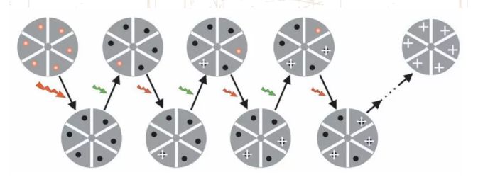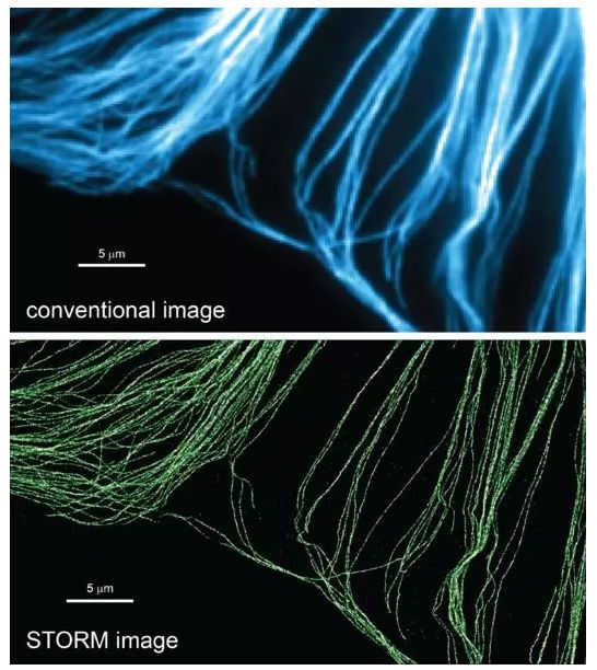 STORM技術(shù)中熒光開關(guān)原理圖 PALM技術(shù)中,使用GFP突變體作為光活化蛋白(PA-GFP)來標(biāo)記靶蛋白,并在細(xì)胞中表達(dá)。用405nm激光器低能量照射細(xì)胞表面,一次僅激活出稀疏分布的幾個(gè)熒光分子,然后用561nm激光激發(fā)得到熒光,通過高斯擬合來精確定位這些熒光分子,在確定這些分子的位置后,長(zhǎng)時(shí)間使用561nm激光來漂白這些已經(jīng)定位正確的熒光分子后,使他們不能夠被下一輪的激光再激活出來。再分別用405nm和561nm激光來激活、激發(fā)和漂白其他熒光分子,多次成像后,將這些分子的熒光圖像合成到一張圖上,得到了比傳統(tǒng)光學(xué)顯微鏡至少高10倍以上的分辨率。PALM顯微鏡的分辨率僅僅受限于單分子成像的定位精度,理論上來說可以達(dá)到1nm的數(shù)量級(jí)。PALM的成像方法只能用來觀察外源表達(dá)的蛋白質(zhì),而對(duì)于分辨細(xì)胞內(nèi)源蛋白質(zhì)的定位無能為力。 STROM與PALM的基本原理一致,區(qū)別在于STORM使用的熒光開關(guān)基團(tuán)是有機(jī)熒光分子對(duì),而PALM使用的熒光開關(guān)基團(tuán)是熒光蛋白分子,由于STORM具有對(duì)細(xì)胞內(nèi)源性生物分子成像的優(yōu)勢(shì),目前STORM在活細(xì)胞等生物體系的應(yīng)用更加廣泛。在空間分辨率上,STORM可以達(dá)到10-20nm,PALM可以達(dá)到20-30nm;在時(shí)間分辨率上,STORM可以達(dá)到1s,而PALM約為30s。