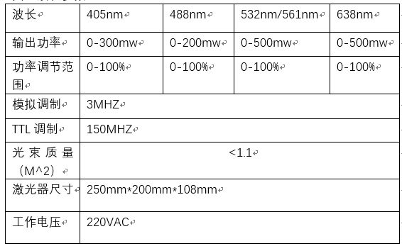 產(chǎn)品特點(diǎn): 客戶可以自由選擇合束激光的數(shù)量(2個(gè)到 8個(gè)波長(zhǎng)可選) 自由空間光輸出/各種光纖耦合輸出可選; 單光路或多光路輸出 智能性強(qiáng)(遠(yuǎn)程診斷修復(fù)和自我保護(hù)功能); 軟件控制(通過USB和RS232接口) 高穩(wěn)定性,光束質(zhì)量高,噪聲低; 百M(fèi)HZ的TTL調(diào)制功能和模擬調(diào)制; 結(jié)構(gòu)緊湊,堅(jiān)固耐用; 可根據(jù)客戶的要求定制,不收取定制費(fèi); 高性價(jià)比; 主要應(yīng)用:超分辨率成像、共聚焦顯微鏡、熒光激發(fā)、流式細(xì)胞儀、SPIM、FRAP、TIRF…… 典型波長(zhǎng)參數(shù):