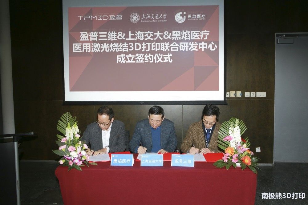 2019年2月21日,上海交通大學(xué)生醫(yī)工學(xué)院、盈普三維和黑焰醫(yī)療共同發(fā)布“共建醫(yī)用激光燒結(jié)3D打印聯(lián)合研發(fā)中心”戰(zhàn)略合作計(jì)劃,并于“2019TCT | SLS、SLA技術(shù)創(chuàng)新研討會(huì)暨盈普2019新品發(fā)布”會(huì)議中正式簽署戰(zhàn)略合作協(xié)議。盈普三維董事長(zhǎng)招鑾、CEO翟蓮子,上海交通大學(xué)醫(yī)學(xué)院附屬第九人民醫(yī)院戴尅戎院士、王金武教授團(tuán)隊(duì),黑焰醫(yī)療董事長(zhǎng)陸益棟等三方有關(guān)部門負(fù)責(zé)人、專家學(xué)者共同參加了簽約儀式。