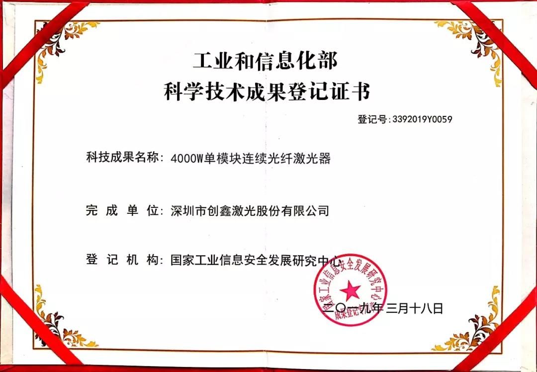 25000W多模連續(xù)光纖激光器工信部頒發(fā)科技成果登記證書