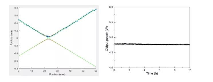 圖1:(a)全光纖超連續(xù)譜光源的M2測試情況,插圖為CCD采集到的光束束腰處光斑光強分布圖;(b)全光纖超連續(xù)譜光源的輸出功率穩(wěn)定性測試結(jié)果