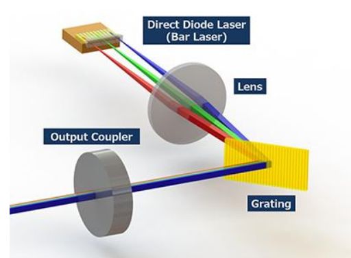 采用這種技術(shù),只需增加激光源數(shù)量,就可以調(diào)整功率,同時(shí)保持光束質(zhì)量。所產(chǎn)生的激光強(qiáng)度,可能比傳統(tǒng)藍(lán)色激光系統(tǒng)高出兩個(gè)量級(jí)。這項(xiàng)技術(shù)將促進(jìn)新興的微細(xì)加工工藝發(fā)展,預(yù)計(jì)在工業(yè)應(yīng)用內(nèi)的需求將不斷增長(zhǎng),如汽車行業(yè)。 目前,汽車產(chǎn)業(yè)正在走向“電氣化”和“微型化”,同時(shí)要求實(shí)現(xiàn)“高剛性”、“設(shè)計(jì)靈活性”和“生產(chǎn)力”。在這一背景下,為了加工銅、金、塑料等各種材料,人們對(duì)微加工激光器的期待越來越高。尤其是在汽車發(fā)動(dòng)機(jī)和電池的銅制造領(lǐng)域,對(duì)吸光率高的藍(lán)色激光需求很高。只有輸出功率及光束質(zhì)量高的激光束源,才能滿足高效率加工要求。 松下公司將100多個(gè)二極管發(fā)射器與WBC技術(shù)相結(jié)合,從而提升高光束質(zhì)量藍(lán)色激光器(波段為400 - 450nm)的輸出功率。這種WBC技術(shù)可聚集多個(gè)不同波長(zhǎng)發(fā)射器的光束,使其以每個(gè)波長(zhǎng)對(duì)應(yīng)的角度入射到衍射光柵上。然后,在共用半透明鏡體和發(fā)射器各邊緣面之間,形成諧振器。最后,輸出光束功率達(dá)到135 W。接下來,松下將開發(fā)一套配備這種激光束源的加工系統(tǒng),并優(yōu)化激光加工工藝。