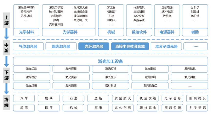 輕舟已過萬重山,我國激光器廠商蓬勃發(fā)展,部分躋身行業(yè)前列,已有與進口產(chǎn)品“掰手腕”的能力。 作為第一批進入光纖激光器產(chǎn)業(yè)的國內(nèi)企業(yè),創(chuàng)鑫激光秉持著“器件先行”的戰(zhàn)略,實現(xiàn)了多個核心器件的自產(chǎn),在技術(shù)門檻和成本管控上構(gòu)建了競爭優(yōu)勢。經(jīng)過十幾年的發(fā)展,創(chuàng)鑫激光的光纖激光器銷售額排名國產(chǎn)廠商的第二位。 然而,隨著市場份額進一步向頭部廠商集中,國內(nèi)光纖激光器市場進入了“刺刀見紅”的肉搏戰(zhàn),價格戰(zhàn)直接影響到創(chuàng)鑫激光等頭部廠商的盈利能力。創(chuàng)鑫激光早就踐行的“超高功率技術(shù)彎道超車”戰(zhàn)略,能否幫助創(chuàng)鑫激光殺出重圍? 器件先行,實現(xiàn)自產(chǎn) 激光器行業(yè)位于激光產(chǎn)業(yè)中游,其上游為光學(xué)材料、光學(xué)器件、數(shù)控系統(tǒng)以及電學(xué)器件生產(chǎn)企業(yè);下游是將各部件集成出品的激光加工設(shè)備生產(chǎn)商。