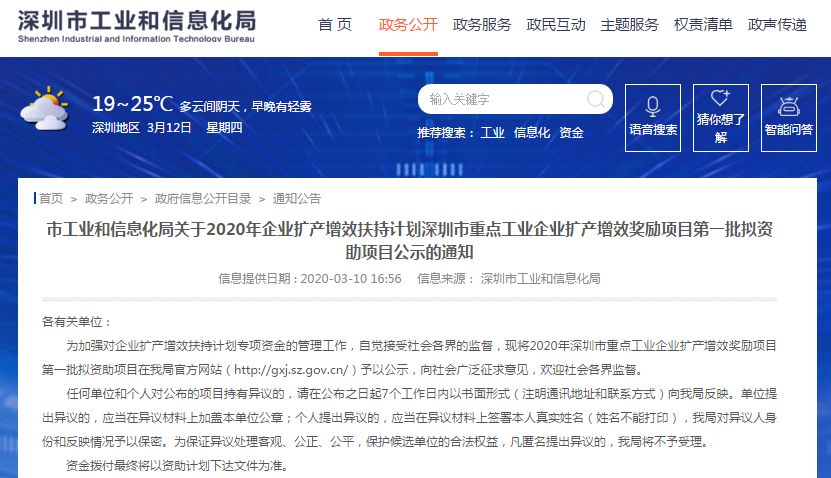 日前,深圳市工業(yè)和信息化局發(fā)布了《關(guān)于2020年企業(yè)擴(kuò)產(chǎn)增效扶持計(jì)劃深圳市重點(diǎn)工業(yè)企業(yè)擴(kuò)產(chǎn)增效獎勵項(xiàng)目第一批擬資助項(xiàng)目公示的通知》。