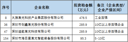 通知提出:為加強(qiáng)對企業(yè)擴(kuò)產(chǎn)增效扶持計(jì)劃專項(xiàng)資金的管理工作,自覺接受社會各界的監(jiān)督,現(xiàn)將2020年深圳市重點(diǎn)工業(yè)企業(yè)擴(kuò)產(chǎn)增效獎勵項(xiàng)目第一批擬資助項(xiàng)目在我局官方網(wǎng)站(http://gxj.sz.gov.cn/)予以公示,向社會廣泛征求意見,歡迎社會各界監(jiān)督。 2020年重點(diǎn)工業(yè)企業(yè)擴(kuò)產(chǎn)增效獎勵項(xiàng)目擬資助計(jì)劃(第一批)名單共有214家企業(yè),擬資助金額總計(jì)達(dá)3.95億元。其中激光企業(yè)有4家,分別是大族激光、創(chuàng)鑫激光、迪能激光、海目星激光。