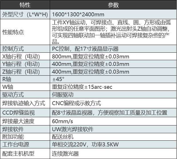 焊接質(zhì)量高 設(shè)備采用國(guó)產(chǎn)或進(jìn)口激光光源,有焊接深寬比大,能量集中,熱影響區(qū)小等特點(diǎn),有效解決了醫(yī)療器械的焊接質(zhì)量難點(diǎn)。 焊接精度高 設(shè)備的運(yùn)動(dòng)軸以伺服電機(jī)驅(qū)動(dòng),采用精密滾珠絲杠和直線導(dǎo)軌作為傳動(dòng)元件,重復(fù)定位精度為±0.02mm/300mm。旋轉(zhuǎn)軸以伺服驅(qū)動(dòng),重復(fù)定位精度±10arc-sec,有效保證了醫(yī)療器械苛刻的焊接精度要求。 密封、安全 設(shè)備采用結(jié)構(gòu)密封設(shè)計(jì),動(dòng)力部分下沉式布置,有效保護(hù)操作人員的安全。同時(shí)設(shè)備所有用料都經(jīng)過(guò)嚴(yán)格的檢測(cè),用料的環(huán)保、衛(wèi)生,可有力地保證醫(yī)療器械高潔凈生產(chǎn)場(chǎng)所的防污染要求。 過(guò)程實(shí)時(shí)監(jiān)控 設(shè)備配置了工業(yè)CCD監(jiān)控系統(tǒng),可對(duì)產(chǎn)品裝夾過(guò)程和焊接過(guò)程進(jìn)行實(shí)時(shí)監(jiān)控。 成本低、維護(hù)方便 設(shè)備占地面積小且運(yùn)行時(shí)無(wú)需額外耗材,方便實(shí)用,同時(shí)也可因地制宜地根據(jù)客戶的需求進(jìn)行改造、升級(jí),可有效節(jié)約客戶的運(yùn)營(yíng)成本。設(shè)備整體機(jī)構(gòu)設(shè)計(jì)簡(jiǎn)潔,方便班次清潔,日常維護(hù)、保養(yǎng)等操作。 應(yīng)用廣泛 設(shè)備廣泛應(yīng)用于斑馬導(dǎo)絲、一次性使用取石網(wǎng)籃、一次性氣道導(dǎo)絲、鼻膽引流導(dǎo)管、內(nèi)窺鏡、活檢鉗、抗癌放射性棒、心臟起搏器等醫(yī)療器械的焊接生產(chǎn)。 技術(shù)參數(shù)
