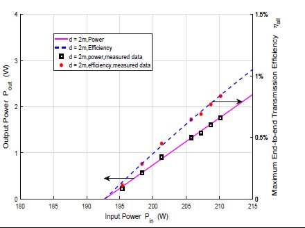 圖3 輸出功率和輸入電功率的關(guān)系(紅色實(shí)線);傳輸效率(藍(lán)色虛線)。 (圖片來(lái)源:上海光機(jī)所)