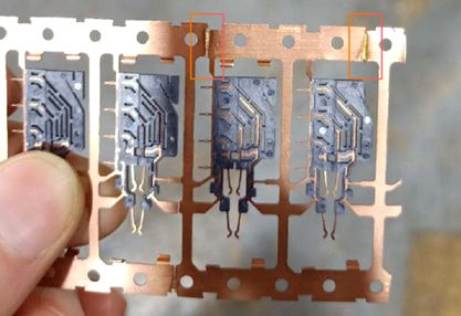 應(yīng)用案例:手機(jī)、PAD、電腦充電線等3C產(chǎn)品插頭點焊; 應(yīng)用要求:0.3mm不銹鋼點焊到不銹鋼基材,要求焊點直徑0.1mm以內(nèi); 應(yīng)用分析:對比YAG點焊,QCW焊點更小,外觀更平整,更適合小型插頭焊接。 2、電子元器件料帶點焊
