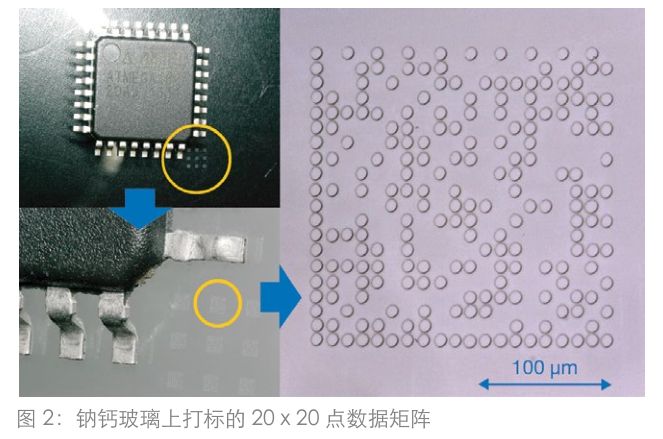 借助 Explorer One 系列,我們演示了移動設(shè)備應(yīng)用 (圖1) 以及鈉鈣玻璃 (圖2) 中使用的陶瓷中的超精細(xì)機(jī)器可讀條形碼的打標(biāo)。憑借紫外波長,我們能夠生成尺寸小于10 µm的點,從而產(chǎn)生20x20點的 200 µm數(shù)據(jù)矩陣。由于Explorer One激光器卓越的光束屬性,我們使用包含 f = 100 mm 遠(yuǎn)心透鏡的振鏡實現(xiàn)了這些小點,即采用適度的聚焦,而沒有復(fù)雜的樣本定位要求。使用振鏡可對 20 x 20 條形碼實現(xiàn)高加工速度和約 100 ms 的打標(biāo)時間。