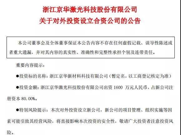 7月29日,浙江京華激光科技股份有限公司發(fā)布對(duì)外投資設(shè)立合資公司的公告。