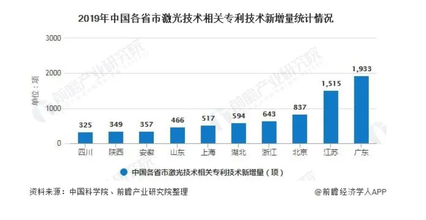 廣東、江蘇是激光技術(shù)創(chuàng)新大省 2019年,中國(guó)共新增激光技術(shù)相關(guān)的專利技術(shù)9581項(xiàng),其中廣東和江蘇新增專利技術(shù)1933項(xiàng)和1515項(xiàng),是我國(guó)激光技術(shù)創(chuàng)新的大省,多年來(lái)一直保持領(lǐng)先的地位;北京和浙江的激光專利技術(shù)新增量均超過(guò)600項(xiàng),分別為837項(xiàng)和643項(xiàng),位于第二梯隊(duì);湖北、上海、山東、安徽、陜西、四川位于第三梯隊(duì),激光專利技術(shù)新增量超過(guò)300項(xiàng)。 總體來(lái)講,我國(guó)激光技術(shù)專利呈增長(zhǎng)趨勢(shì),反映了我國(guó)激光技術(shù)的創(chuàng)新和能力不斷增強(qiáng),而技術(shù)的創(chuàng)新有助于打破國(guó)外的技術(shù)壁壘,提升我國(guó)激光產(chǎn)品在國(guó)際市場(chǎng)的競(jìng)爭(zhēng)能力。
