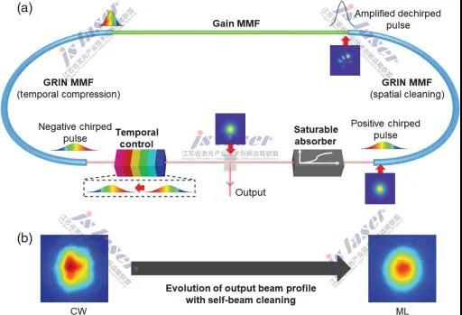 多模光纖腔體的概念圖和時空鎖模光束自清潔的示意圖 ▲圖解 :(a) 分散管理腔設(shè)計的概念圖,該設(shè)計考慮了時空動力學(xué)。激光泵浦的示意圖在本圖中沒有顯示;(b) 鎖模機理的示意圖和實驗測量得到的光束結(jié)果的演化 。圖中符號的含義:CW, 連續(xù)波; ML, 鎖模.