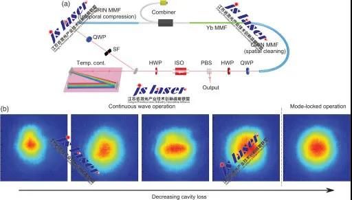 ▲圖解:(a) 激光腔的示意圖和光束輪廓的測量,其中 QWP, quarter-wave plate(四分之一波片); HWP, half-wave plate(半波片); PBS, polarizing beam splitter(偏振分束器); ISO, isolator(隔離器); SF, spatial filter(空間濾波). (b) 近場輸出光束輪廓的演化,在減少腔體損失時,從連續(xù)波到鎖模的操作且能量為8-nJ的脈沖能量