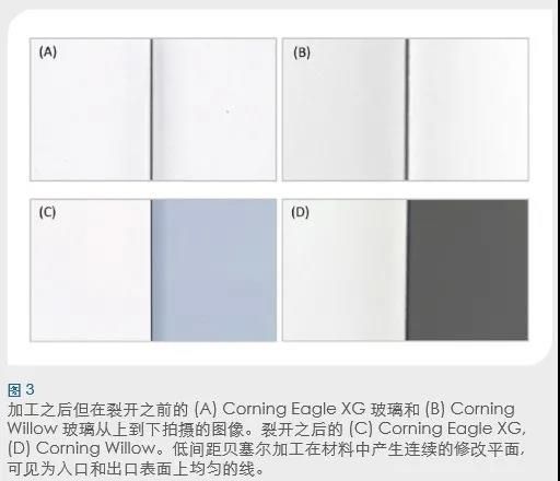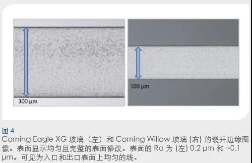 Corning Eagle XG 和 Corning Willow 玻璃都以 100 mm/s 的平移速度和 100 kHz 脈沖重復(fù)頻率 (PRF) 進(jìn)行加工, 在材料上產(chǎn)生極低間距的加工及上下表面形成連續(xù)均勻的修 改線。 在手動裂開之后, 目視檢查發(fā)現(xiàn)完整均勻的邊緣表面修改(圖4)。表面紋理顯得輕微顆;, 300 µm Eagle XG 玻 璃和100 µm Willow 玻璃通過光學(xué)輪廓儀表征的表面粗糙度分別約為 0.2 µm 和 0.1 µm。