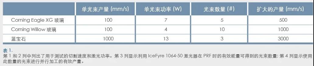 我們用目視(圖 6)和光學(xué)輪廓儀對裂開的邊緣進(jìn)行了檢查。目視檢查發(fā)現(xiàn)顆粒度類似于玻璃, 但可以感覺到更粗糙。這種額外的粗糙度體現(xiàn)在 Ra 中, 測得為 ~0.3 µm,略高于玻璃的值, 這可能是因為該工藝所需的更大的貝塞爾半徑和更大的間距。 由于貝塞爾區(qū)域的狹窄, 材料加工所需的脈沖能量遠(yuǎn)低于指定重復(fù)頻率時可用的最大能量。根據(jù)下表 1, 這樣可以使用分束通過并行加工擴(kuò)大產(chǎn)量。通過適當(dāng)?shù)墓鈱W(xué)元件和工藝參數(shù), 使用 IceFyre 1064-50 激光器的貝塞爾光束 切割能夠以極高的質(zhì)量快速加工各種薄透明材料