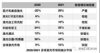 受疫情影響而業(yè)績(jī)嚴(yán)重下滑的領(lǐng)域 醫(yī)療和美容激光市場(chǎng) 由于新冠疫情,醫(yī)療和美容激光領(lǐng)域受到了嚴(yán)重影響。2020年,許多人因疫情推遲了他們預(yù)定的手術(shù),取消了每半年的定期牙醫(yī)清洗,或預(yù)定的整形手術(shù)。因此,醫(yī)院和醫(yī)生的收入大幅下降。 據(jù)統(tǒng)計(jì),牙科手術(shù)激光減少了20%。雖然牙科領(lǐng)域有個(gè)亮點(diǎn), 但不大。新冠疫情使牙醫(yī)們停止使用超聲波潔牙機(jī),因?yàn)樗鼤?huì)感染病人,這給激光潔牙機(jī)帶來(lái)了很好的替代機(jī)會(huì)?傮w而言,牙科激光的市場(chǎng)不大,因此預(yù)計(jì)不會(huì)對(duì)整體醫(yī)療和美容激光市場(chǎng)有太大影響。 同時(shí)眼科激光器減少了20%,整容手術(shù)激光器減少了35%,唯一的亮點(diǎn)是手術(shù)激光,去年增長(zhǎng)了約4%,總體來(lái)說(shuō),受疫情影響市場(chǎng)不是很好。當(dāng)收入下降時(shí),這些醫(yī)院和醫(yī)生推遲購(gòu)買(mǎi)新的設(shè)備。2020年,激光醫(yī)療和美容領(lǐng)域的收入至少下降25%,是所有激光領(lǐng)域中表現(xiàn)最差的。預(yù)計(jì)該領(lǐng)域?qū)⒃?021年恢復(fù)正常, 并預(yù)計(jì)今年醫(yī)療和美容激光的收入有較大反彈,增長(zhǎng)達(dá)28%。 受疫情影響較輕的領(lǐng)域 激光打印機(jī)、激光顯示和娛樂(lè)市場(chǎng) 人們可能認(rèn)為,2020年,受疫情影響,有很多人居家辦公,同時(shí)許多學(xué)生在家學(xué)習(xí),所以可以預(yù)期打印機(jī)的銷量會(huì)有所增加,因?yàn)槿藗冃枰?gòu)買(mǎi)打印機(jī),以便在家中使用,但數(shù)據(jù)顯示,激光打印機(jī)的銷售下降了約5%。激光顯示也不是最燦爛的一年。2020年激光表演雖小有增長(zhǎng),但不多,并且無(wú)人機(jī)燈光表演正在取代激光表演,就像之前的激光表演取代了煙花表演一樣。 最后是顯示設(shè)備,如投影儀或激光電視機(jī)等。因?yàn)槿藗儾怀霾盍,也不去電影院看電影,所以傾向于把房屋內(nèi)的屏幕變得更大。同時(shí)家庭辦公室需要購(gòu)買(mǎi)商務(wù)型投影儀。因此,2020年激光投影儀和顯示器的銷售有所增長(zhǎng),約8%。這個(gè)領(lǐng)域市場(chǎng)整體變化速度較慢,今年估計(jì)增長(zhǎng)5%左右。 激光加工和光刻機(jī)市場(chǎng) 光刻機(jī)是用于制造半導(dǎo)體芯片的。其中的激光器分為兩類:深紫外線激光器(準(zhǔn)分子激光器)和極端紫外激光器(使用CO2激光器的光源)。逐漸地,大部分激光器將從深紫外線光刻機(jī)向極端紫外光刻機(jī)轉(zhuǎn)移。 2020年,半導(dǎo)體光刻市場(chǎng)增長(zhǎng)了約5%。因此用于光刻機(jī)的激光器也同有增長(zhǎng)。疫情對(duì)此市場(chǎng)影響較小。光刻市場(chǎng)約占整個(gè)激光加工市場(chǎng)的25%,其余的是工業(yè)激光材料加工市場(chǎng)。 2020年是全球工業(yè)激光材料加工艱難的一年。2019年下半年開(kāi)始顯示疲軟跡象,所有人都擔(dān)心經(jīng)濟(jì)可能不會(huì)增長(zhǎng)很快,然后又遭遇了百年不遇的新冠疫情。但是, 由于中國(guó)工業(yè)激光市場(chǎng)在2020年中期和下半年確實(shí)表現(xiàn)不錯(cuò) (預(yù)計(jì)中國(guó)工業(yè)激光市場(chǎng)2020年增長(zhǎng)在10%以上),加上2020年微電子加工領(lǐng)域的復(fù)蘇,即用于制造半導(dǎo)體、平板顯示器、印刷電路板和太陽(yáng)能電池的激光加工系統(tǒng)需求增長(zhǎng), 和對(duì)高功率切割和電池制造領(lǐng)域的強(qiáng)勁需求,2020年全球工業(yè)激光保持了個(gè)位數(shù)的增長(zhǎng), 約3%,中國(guó)市場(chǎng)功不可沒(méi)。隨著全球經(jīng)濟(jì)的復(fù)蘇, 預(yù)計(jì)今年全球工業(yè)激光將增長(zhǎng)10%左右。 不受疫情影響的領(lǐng)域 科研和軍工市場(chǎng) 2020年,美國(guó)在科研方面的總體支出增長(zhǎng)了約2%,中國(guó)的研發(fā)支出增長(zhǎng)了6%以上。美國(guó)和中國(guó)兩個(gè)國(guó)家在研發(fā)上的總支出約占全球研發(fā)總支出的50%以上,可謂舉足輕重。2020年研發(fā)用激光器總體有所增加,基本不受疫情影響。因?yàn)檫@些激光器訂單大多數(shù)都是在疫情前簽約的,因此我們還沒(méi)有真正看到疫情在該領(lǐng)域的影響。 而軍工市場(chǎng)則完全不受疫情的影響。這些都是提前幾年簽訂的大合同。在過(guò)去幾年中,軍用激光器市場(chǎng)發(fā)生了很大變化。十幾年前,美國(guó)曾嘗試使用激光來(lái)摧毀洲際彈道導(dǎo)彈(ICBM)的發(fā)射,然而事實(shí)上這是一個(gè)沒(méi)有希望的項(xiàng)目。如今美國(guó)軍方更加關(guān)心如何防御和摧毀小型目標(biāo), 如無(wú)人機(jī)等。在這方面,定向能激光武器證明是非常有效的。俄羅斯和中國(guó)等其他國(guó)家也在研發(fā)這些武器。 因此,軍用激光,特別是定向能激光武器的市場(chǎng)正在迅速增長(zhǎng),其中還包括諸如紅外對(duì)抗、軍用通信激光以及其他軍用傳感器系統(tǒng)之類的東西?傮w而言,2020年科研和軍用激光市場(chǎng)增長(zhǎng)了24%,完全不受疫情影響。預(yù)計(jì)201年也會(huì)增長(zhǎng)約25%。 因疫情而獲增長(zhǎng)的領(lǐng)域 激光通訊市場(chǎng) 疫情迫使人們?cè)诨ヂ?lián)網(wǎng)上進(jìn)行幾乎一切的溝通,無(wú)論是在家辦公還是在家學(xué)習(xí),