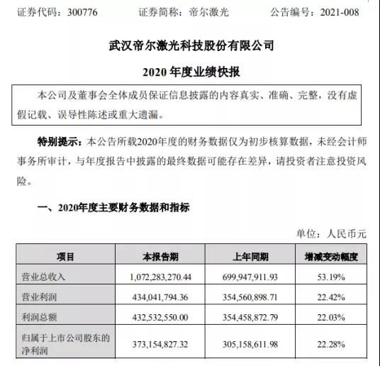 4月9日,帝爾激光發(fā)布2020年度業(yè)績快報(bào)公告,公告顯示,2020年1-12月營業(yè)總收入為1,072,283,270.44元,比上年同期增長53.19%;歸屬于上市公司股東的凈利潤為373,154,827.32元,比上年同期增長22.28%。