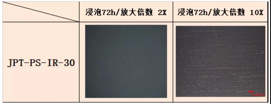 將浸泡后的銹鋼片表面放大觀察,發(fā)現(xiàn)JPT-PS-IR-30標(biāo)記的黑色經(jīng)72小時(shí)浸泡后表面未出現(xiàn)色塊脫落和褪色的情況,如下圖:
