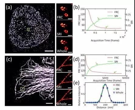 超分辨熒光成像是本世紀(jì)顯微光學(xué)成像領(lǐng)域最重要的突破之一,被授予了2014年諾貝爾化學(xué)獎。其中,超分辨定位成像是一種代表性的超分辨熒光成像技術(shù)。該技術(shù)將單分子熒光成像與高精度分子定位算法相結(jié)合,在較簡單的光學(xué)成像系統(tǒng)上,實現(xiàn)了20~30 nm的超高空間分辨率,為生物醫(yī)學(xué)研究提供了前所未有的機會。但是,在超分辨定位成像實驗過程中,為了盡量提高最終圖像的分辨率,研究人員普遍采集盡可能多的原始圖像,導(dǎo)致由于大量圖像過采樣帶來的數(shù)據(jù)傳輸和存儲資源浪費。 在武漢光電國家研究中心Britton Chance生物醫(yī)學(xué)光子學(xué)研究中心黃振立教授的指導(dǎo)下,2016級博士生王鈺潔提出了利用結(jié)構(gòu)分辨指數(shù)來判斷超分辨定位成像實驗終止時間的方法。該方法在不犧牲超分辨圖像空間分辨能力的前提下,大大減少了原始圖像的過采集數(shù)量,節(jié)約了數(shù)據(jù)傳輸和存儲資源。該研究成果以題為“Structure-resolving index: an efficient criterion for ending image acquisition in super-resolution localization microscopy”論文發(fā)表在2019年6月1日Optics Letters上( Vol. 44, Iss. 11, pp. 2633-2636)。