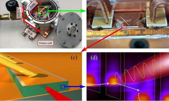 熱電冷卻太赫茲量子級聯(lián)激光器中單個(gè)激光脊形條示意圖 令人興奮的是,蘇黎世ETH量子電子學(xué)研究所Jerome Faist小組的Lorenzo Bosco、Martin Franckie及其同事們實(shí)現(xiàn)了一種能在210K(-63℃)溫度下工作的太赫茲量子級聯(lián)激光器,達(dá)到了這種裝置迄今為止的最高工作溫度。更重要的是,這次操作在不需要低溫冷卻劑的溫度范圍內(nèi)演示,乃屬首次。Bosco等人采用熱電制冷方式,相比制冷設(shè)備更緊湊、更便宜、更易于維護(hù)。這一進(jìn)展掃除了通往各種實(shí)際應(yīng)用道路上的主要障礙。 面向?qū)嶋H應(yīng)用的量子級聯(lián)激光器 長期以來,量子級聯(lián)激光器(QCL)被認(rèn)為是太赫茲器件的自然概念。像眾多廣泛用于可見光到紅外波段的激光器一樣,量子級聯(lián)激光器也是基于半導(dǎo)體材料的。但是,與條形碼閱讀器或激光指示器中使用的典型半導(dǎo)體激光器相比,量子級聯(lián)激光器的工作原理與實(shí)現(xiàn)光發(fā)射的原理完全不同。簡言之,量子級聯(lián)激光器是由精確設(shè)計(jì)的半導(dǎo)體結(jié)構(gòu)的重復(fù)堆疊而構(gòu)建的(見圖c),其設(shè)計(jì)可以實(shí)現(xiàn)適當(dāng)?shù)碾娮榆S遷(見圖d)。