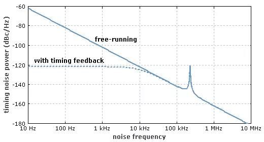 圖:理論計(jì)算得到的10 GHz Er:Yb玻璃小型激光器在量子極限下的時(shí)間抖動譜。實(shí)際中由于存在技術(shù)支持噪聲,低頻率噪聲(小于10 kHz)會更高。弛豫振蕩(約230 kHz)也有一部分轉(zhuǎn)化成了時(shí)間抖動。采用反饋系統(tǒng)可以抑制長期時(shí)間偏移,因此極大減小低頻抖動。 不同種類鎖模激光器的時(shí)間抖動(例如,小型體激光器,光纖激光器,或者外腔二極管激光器)可以非常。ㄈ鐖D),有時(shí)會比高質(zhì)量的電子振蕩器低很多。尤其是在很短的時(shí)間尺度內(nèi),激光器可以被當(dāng)做精準(zhǔn)的時(shí)間參考。采用自參考頻率梳可以將長期時(shí)間偏移抑制到極低的水平。