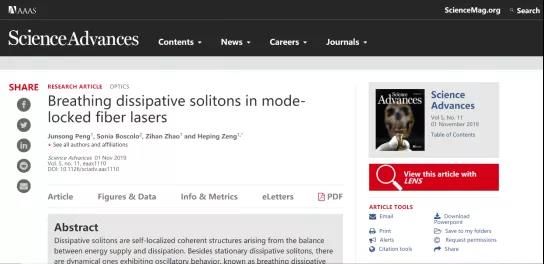 《科學(xué)》子刊刊登曾和平教授課題組究成果 會“呼吸”的非線性波卻探測、產(chǎn)生兩難 光孤子一直是非線性光學(xué)研究前沿,它是光束在傳播過程中由非線性效應(yīng)平衡衍射/色散效應(yīng)的結(jié)果,通俗來說,孤子是一種在傳輸時不會發(fā)散的波包。而與之不同的是,呼吸子在傳輸過程中其大小會發(fā)生周期性變化(周期性地發(fā)散再匯聚),好像人在不斷地呼氣(發(fā)散)、吸氣(匯聚)的過程。由于呼吸子這種非線性波和許多非線性現(xiàn)象有著內(nèi)在關(guān)聯(lián),有助于理解例如怪波(rogue wave),湍流,颶風(fēng),海嘯等極端現(xiàn)象,引發(fā)學(xué)界的廣泛關(guān)注。 此前,呼吸子的產(chǎn)生局限于能量保守系統(tǒng),例如水波、單通光纖系統(tǒng)。然而大量現(xiàn)實世界的物理系統(tǒng)都是耗散系統(tǒng),那呼吸子是否也可以在耗散系統(tǒng)里產(chǎn)生?該課題組注意到飛秒激光器是一個典型的耗散系統(tǒng),最近的理論模擬表明飛秒激光器可能可以產(chǎn)生呼吸子。然而實驗上產(chǎn)生呼吸子的難點在于理論模型過于簡化,很難與復(fù)雜的飛秒激光系統(tǒng)相聯(lián)系。此外,呼吸子在納秒量級快速變化,傳統(tǒng)探測技術(shù)響應(yīng)時間在毫秒量級,根本無法探測到呼吸子。 揭示呼吸子和呼吸子分子的“面貌”
