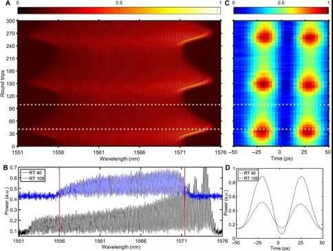 圖1:呼吸子高速演化動力學(xué) A,B分別是呼吸子的光譜和時域的周期性演化。橫坐標是距離。隨著距離的增加可以看出呼吸子的光譜和時域均出現(xiàn)周期性變化。當(dāng)增強非線性時,呼吸子的這種周期性變化會變?nèi)酰―,E),進一步增強非線性時,孤子會出現(xiàn)。G,H是孤子的光譜和時域,由圖可以看出這兩個參量在傳輸過程中均保持不變。