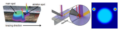 圖3.2 激光焊接(左)與平頂光斑(右) 相關DOE產品:平頂發(fā)生器,勻化器,分束器,C型發(fā)生器,高效率雙焦DOE 釬焊 在釬焊過程中,激光燒熔焊條并將兩塊金屬焊接在一起,這種工藝廣泛使用在汽車工業(yè)中。如果被焊接金屬在焊條熔融之前被清潔、預熱,將能提升焊接效果。 專門為這種工藝訂制的勻化器,可以在主焊的平頂光斑前端兩側產生兩個小光斑用于待焊金屬的清洗和加熱,提升釬焊的強度和焊縫的整潔度。