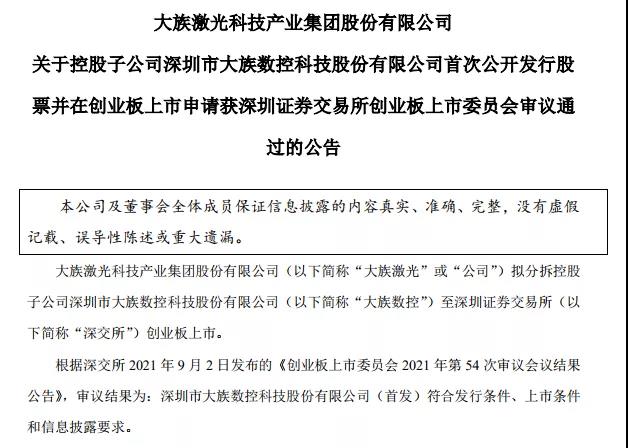 深交所 2021 年 9 月 2 日發(fā)布的《創(chuàng)業(yè)板上市委員會 2021 年第 54 次審議會議結(jié)果公告》,審議結(jié)果為:深圳市大族數(shù)控科技股份有限公司(首發(fā))符合發(fā)行條件、上市條件和信息披露要求。