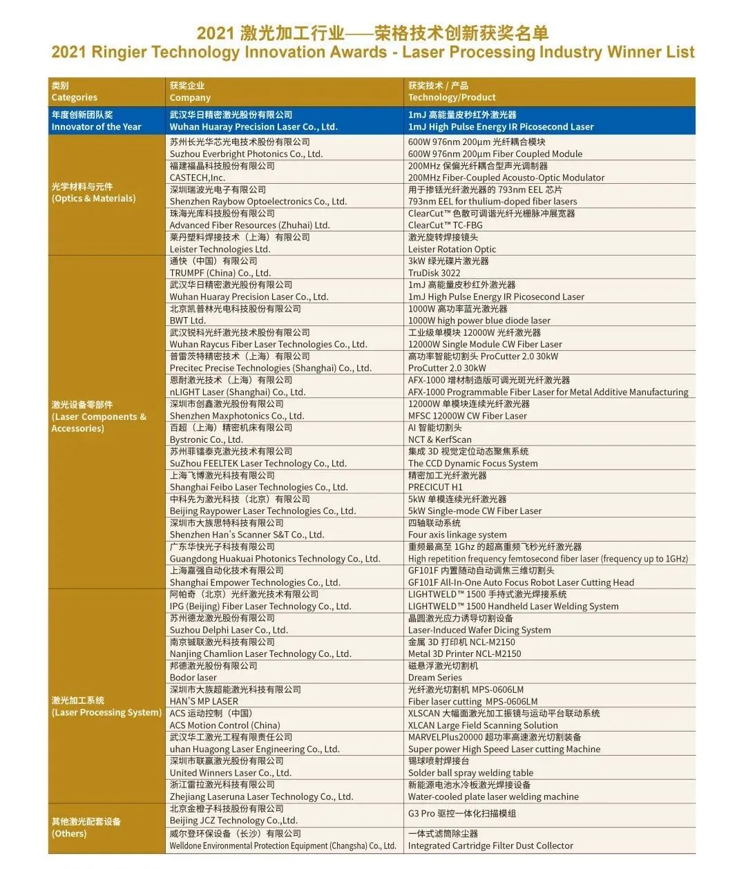 在經(jīng)歷了1個(gè)月的“陰霾期”之后,上海中風(fēng)險(xiǎn)地區(qū)終于“清零”。 2021年9月9日,“2021激光加工行業(yè)—榮格技術(shù)創(chuàng)新獎(jiǎng)”頒獎(jiǎng)典禮也終于如期在上海龍之夢(mèng)大酒店順利舉行。 今年,激光加工行業(yè)-榮格技術(shù)創(chuàng)新獎(jiǎng)共收到了來(lái)自57家企業(yè)的60項(xiàng)創(chuàng)新技術(shù)參報(bào),在“光學(xué)材料與元件”、“激光設(shè)備零部件”、“激光加工系統(tǒng)”、“其他激光配套設(shè)備”四大類別中激烈競(jìng)爭(zhēng)。最終30項(xiàng)創(chuàng)新獎(jiǎng)技術(shù)及1家企業(yè)脫穎而出,分獲此次的技術(shù)創(chuàng)新獎(jiǎng)以及年度創(chuàng)新團(tuán)隊(duì)獎(jiǎng)。