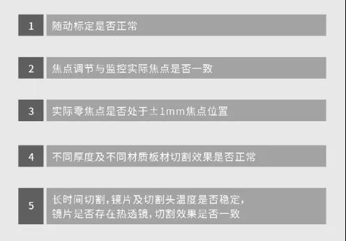 維護(hù): 1、切割頭使用前,建議在切割頭四周纏一層膠布(使用撕下無殘留膠),避免后期維修時縫隙中的灰塵進(jìn)去切割頭內(nèi)部; 2、萬瓦切割頭內(nèi)部鏡片一旦有臟污或損傷,推薦采用替換方式,不建議取出清潔,避免造成二次更嚴(yán)重污染; 3、萬瓦切割頭除了更換下保護(hù)鏡片可在切割機(jī)上操作,上保護(hù)鏡片及準(zhǔn)直聚焦鏡片更換務(wù)必在千級以上的無塵環(huán)境中進(jìn)行; 4、萬瓦切割頭鏡片檢查,先用白紙查看萬瓦光纖激光器紅光是否有黑點(diǎn),然后低功率出激光,用黑色感光紙查看光斑是否有點(diǎn),最后取出鏡片在顯微鏡下檢查。 3、萬瓦切割頭測試流程