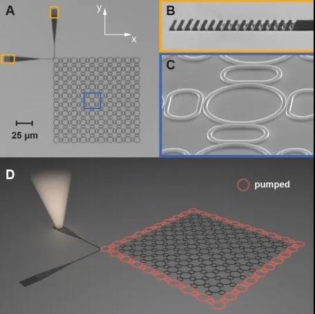 從拓?fù)浣^緣體到拓?fù)浼す馄?/strong> 拓?fù)浣^緣體是革命性的量子材料,內(nèi)部絕緣,但表面導(dǎo)電,與此同時(shí)不產(chǎn)生損耗。幾年前,由Mordechai Segev教授領(lǐng)導(dǎo)的技術(shù)小組將這些創(chuàng)新思想引入光子學(xué),并展示了第一個(gè)光子拓?fù)浣^緣體,光在二維波導(dǎo)陣列的邊緣傳播,不受缺陷或無(wú)序的影響。這開(kāi)啟了一個(gè)新的領(lǐng)域——“拓?fù)涔庾訉W(xué)”,目前有數(shù)百個(gè)小組在這個(gè)領(lǐng)域進(jìn)行積極的研究。2018年,同一小組還找到了一種方法,利用光子拓?fù)浣^緣體的特性,迫使許多微環(huán)激光器鎖定在一起,充當(dāng)單個(gè)激光器。但是該系統(tǒng)仍存在一個(gè)瓶頸——光在同一平面提取光的光子芯片中不斷循環(huán)。這意味著整個(gè)系統(tǒng)再次受到發(fā)光設(shè)備的功率限制。
