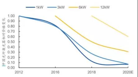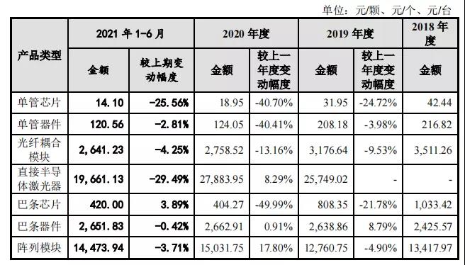 半導(dǎo)體激光芯片性能與生產(chǎn)成本的變化趨勢圖。注:(1)資料來源于 Laser Focus World;(2)亮度用以衡量半導(dǎo)體激光芯片的性能,表示一定發(fā)光尺寸下的功率;(3)以 1985 年生產(chǎn)成本為基準(zhǔn)生產(chǎn)成本。 以長光華芯為例,近幾年其單管芯片、巴條芯片、單管器件、光纖耦合模塊等產(chǎn)品價格整體呈下降趨勢,如下表所示。