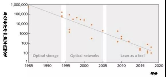 資料來源:Industriallaser、國元證券行研報告。其中 1kW、3kW 光纖激光器以 2012 年市場價格為基準(zhǔn)價格,6 kW、12 kW 分別以 2016 年和 2018 年市場價格為基準(zhǔn)價格。 下游高功率光纖激光器價格快速下降,其降本壓力向上游核心元器件傳導(dǎo),從而加劇了國產(chǎn)高功率半導(dǎo)體激光芯片等核心元器件進(jìn)口替代過程中的價格壓力。 (3)隨著產(chǎn)能逐步釋放、生產(chǎn)工藝不斷進(jìn)步,高功率半導(dǎo)體激光芯片及模塊產(chǎn)品成本及價格下降符合行業(yè)發(fā)展規(guī)律 集成電路遵循“摩爾定律”的規(guī)律發(fā)展,即集成電路上可以容納的晶體管數(shù)目每 18 個月便會增加大約一倍,相應(yīng)其性能每 18 個月也會翻一倍。同樣,半導(dǎo)體激光芯片的發(fā)展亦遵循其自身的“摩爾定律”,即半導(dǎo)體激光芯片的亮度每八年增長十倍,由于技術(shù)的不斷提升、生產(chǎn)工藝的不斷改進(jìn),其生產(chǎn)成本每五年將降低十倍,相應(yīng)市場銷售價格亦隨之下降。