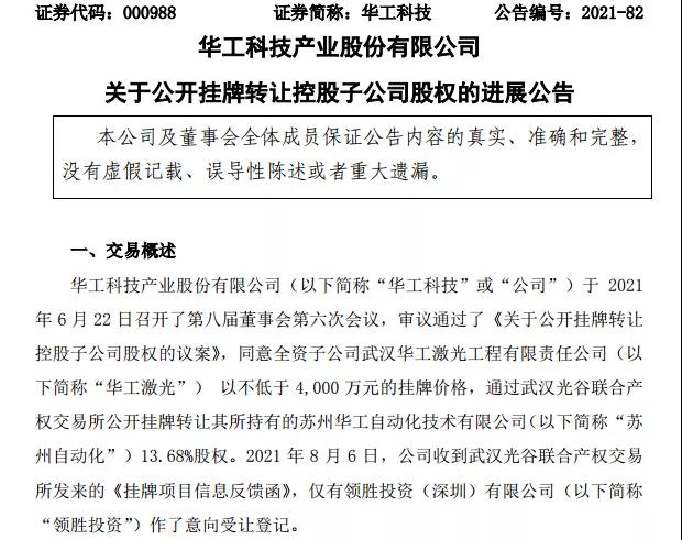 10月8日,華工科技發(fā)布公告,該公司全資子公司武漢華工激光工程有限責(zé)任公司(以下簡(jiǎn)稱(chēng)“華工激光”)以不低于4000萬(wàn)元的掛牌價(jià)格,通過(guò)武漢光谷聯(lián)合產(chǎn)權(quán)交易所公開(kāi)掛牌轉(zhuǎn)讓其所持有的蘇州華工自動(dòng)化技術(shù)有限公司(以下簡(jiǎn)稱(chēng)“蘇州自動(dòng)化”)13.68%股權(quán)。