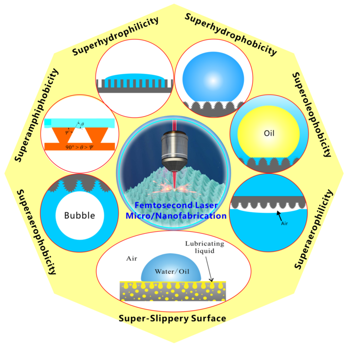 各種飛秒激光誘導(dǎo)的極端潤(rùn)濕性。 激光是20世紀(jì)最偉大的發(fā)明之一。飛秒(10-15s)激光作為一種先進(jìn)的超短脈沖激光器,具有超短脈沖寬度和極高峰值強(qiáng)度兩個(gè)特點(diǎn)。近年來(lái),飛秒激光已成為現(xiàn)代極端和超精密制造的重要工具。飛秒激光幾乎可以燒蝕任何材料,從而在材料表面產(chǎn)生微觀結(jié)構(gòu)。飛秒激光器在微/納米結(jié)構(gòu)的精細(xì)設(shè)計(jì)方面也具有優(yōu)勢(shì)。由于表面微觀結(jié)構(gòu)對(duì)固體基板的潤(rùn)濕性有顯著影響,因此采用飛秒激光加工在基板表面形成特殊的微尺度和納米級(jí)結(jié)構(gòu),獲得各種超潤(rùn)濕性。飛秒激光顯示出設(shè)計(jì)和修改材料潤(rùn)濕性的強(qiáng)大能力。 最近,Yong等人系統(tǒng)地總結(jié)了飛秒激光實(shí)現(xiàn)的超潤(rùn)濕性的實(shí)現(xiàn)和應(yīng)用。受大自然的啟發(fā),通過飛秒激光加工,可以很容易地在固體材料表面制備超潤(rùn)濕微觀結(jié)構(gòu)。超親水性可以通過在親水基板上形成分層微觀結(jié)構(gòu)來(lái)獲得,這導(dǎo)致水徹底潤(rùn)濕材料表面。超疏水性是表面微觀結(jié)構(gòu)和低表面能化學(xué)之間的協(xié)同效應(yīng)。為了實(shí)現(xiàn)超疏水性,有必要使用飛秒激光直接在疏水基板上構(gòu)建分層微觀結(jié)構(gòu),或者在親水基板上構(gòu)建微觀結(jié)構(gòu),然后進(jìn)行低表面能修飾。超疏水材料極大地排斥水溶液。再入微觀結(jié)構(gòu)是實(shí)現(xiàn)超恐光性的關(guān)鍵。超疏水表面還具有超疏水性。
