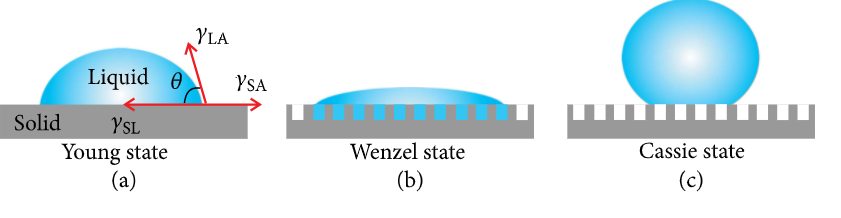 液滴在固體表面上的典型濕潤(rùn)狀態(tài)。(a)液滴在平面基板上。(b)液滴在粗糙基板上,液體填充在表面微結(jié)構(gòu)中。(c)液滴在粗糙基體上,液體不能滲透到表面微觀結(jié)構(gòu)中。 與制備超疏水表面不同,水下超疏油表面可以通過在親水基板上產(chǎn)生微觀結(jié)構(gòu)來(lái)輕松制造。這兩種類型的超疏油表面都對(duì)油和油性液體具有很強(qiáng)的排斥作用,但超疏水材料在空氣中起作用,而水下超疏油材料在水中起作用。飛秒激光誘導(dǎo)的超親水微觀結(jié)構(gòu)通常表現(xiàn)出超疏水性,超疏水微觀結(jié)構(gòu)在水介質(zhì)中顯示出超親熱性。水下超疏水表面可以排斥氣泡,使氣泡難以粘附在水中的材料表面。相比之下,氣泡很容易在水下超嗜氧表面上擴(kuò)散,并被固體表面吸收。 飛秒激光器可以直接在許多固體基板上寫入多孔微觀結(jié)構(gòu)。潤(rùn)滑液進(jìn)一步填充到激光誘導(dǎo)的孔隙中,在固體基體表面形成薄的潤(rùn)滑層。制備的光滑表面對(duì)各種純液體或復(fù)合液體表現(xiàn)出優(yōu)異的排斥性。還簡(jiǎn)要介紹了新興的超聚合物和超金屬疏光性。激光誘導(dǎo)的微結(jié)構(gòu)排斥水下液體聚合物或液態(tài)金屬可用于操作和圖案化聚合物和液態(tài)金屬。獨(dú)特的表面潤(rùn)濕性使飛秒激光加工材料在防液、自潔、防冰/起霧/雪、防污、油/水分離、防腐、減阻、集水、液滴操作、液體圖案化、微流體、實(shí)驗(yàn)室芯片、細(xì)胞工程、浮力增強(qiáng)等方面具有豐富的實(shí)際應(yīng)用。