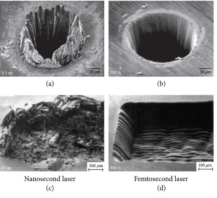 激光鉆孔微孔結(jié)構(gòu)的形貌。(a, b) 100 μm厚度的鋼箔:(a)脈沖寬度為3.3 ns, (b)脈沖寬度為200 fs。(c, d)單晶氯化鈉(NaCl)表面:(c)脈沖寬度為16 ns, (d)脈沖寬度為300 fs。 雖然飛秒激光控制表面潤(rùn)濕性的技術(shù)仍受到加工效率低的缺陷的限制,但其強(qiáng)大的靈活性和加工大多數(shù)給定材料的能力是其他微制造技術(shù)不可替代的。隨著更多超潤(rùn)濕表面的設(shè)計(jì)和制備以及新應(yīng)用的出現(xiàn),這一研究方向?qū)⒂幸粋(gè)廣闊的前景。大家認(rèn)為飛秒激光誘導(dǎo)的超潤(rùn)濕材料的大規(guī)模商業(yè)化應(yīng)用并不遙遠(yuǎn)。