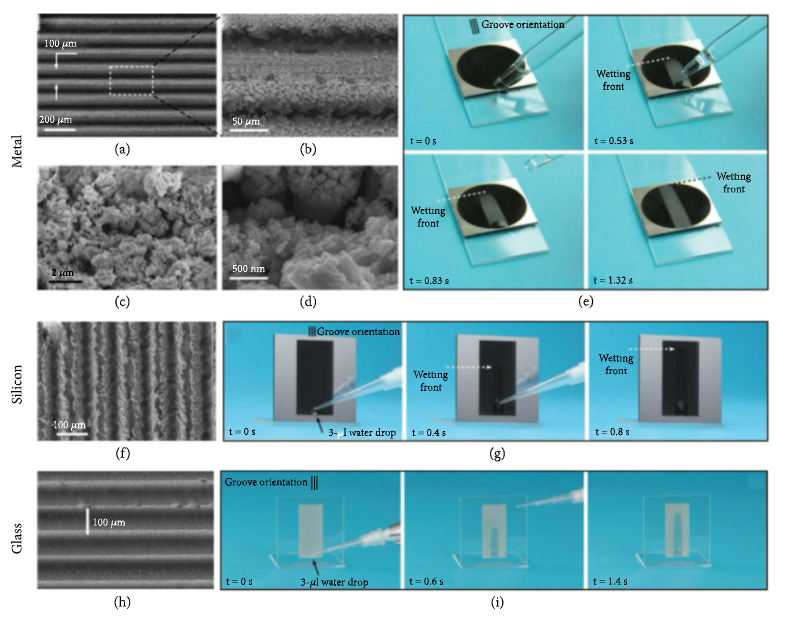 飛秒激光處理后(a-e)鉑、(f, g)硅和(h, i)玻璃表面的超親水性。(a-d)激光誘導(dǎo)的多個(gè)平行微槽在鉑表面。(e)甲醇快速潤(rùn)濕結(jié)構(gòu)金屬表面。(f)硅表面激光誘導(dǎo)的微觀結(jié)構(gòu)。(g)結(jié)構(gòu)硅表面的水潤(rùn)濕和上坡擴(kuò)散。(h)玻璃表面激光誘導(dǎo)微觀結(jié)構(gòu)。(i)結(jié)構(gòu)玻璃表面水潤(rùn)濕、上坡擴(kuò)散。 (文章轉(zhuǎn)載自網(wǎng)絡(luò),如有侵權(quán),請(qǐng)聯(lián)系刪除)