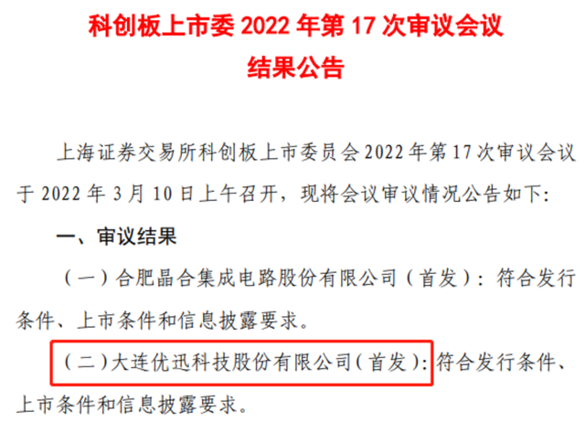 3月10日,據(jù)上交所科創(chuàng)板上市委2022年第17次審議會(huì)議結(jié)果顯示,大連優(yōu)迅科技股份有限公司(以下簡(jiǎn)稱(chēng):優(yōu)迅科技)科創(chuàng)板IPO成功過(guò)會(huì)。