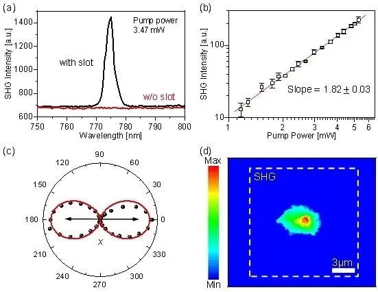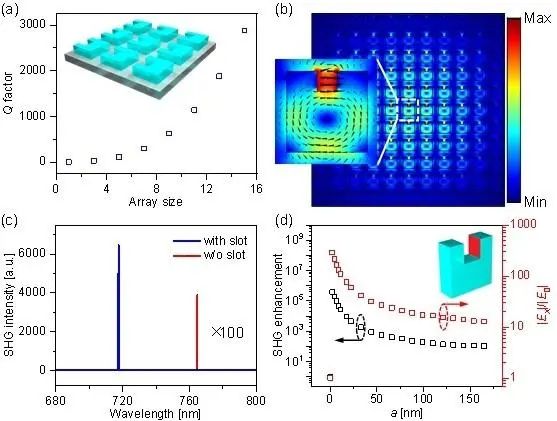 (a) Q因子對開槽納米立方體的陣列尺寸的依賴性。插圖為尺寸為3×3的開槽納米立方體陣列示意圖。(b) 11×11陣列的開槽納米立方體中的電場分布。插圖為中央開槽納米立方體的電場矢量圖。(c)比較具有和不具有凹槽的納米立方體陣列的SHG。(d)空氣槽側(cè)壁表面上的電場增強(qiáng)因子和SHG隨槽寬a的變化。